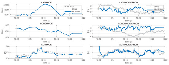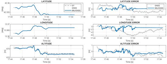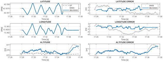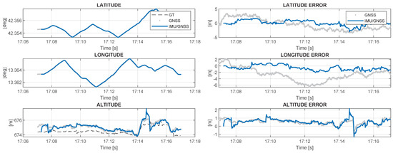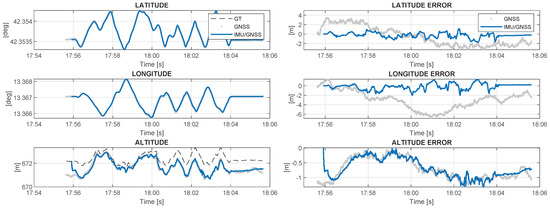 Figure 5 illustrates the functional diagram of the GNSS-INS loose coupling process. It is a closed-loop correction architecture; consequently, the estimated errors in the NED reference frame, for the latitude, for the longitude, for the height, for the velocity and for the attitude are fed back to the inertial navigation processor, where they are used to correct the inertial navigation solution. In this way, the integrated navigation solution of the navigation system is the inertial navigation solution itself, and is obtained, respectively, for the orientation, , the velocity, , and the position, as follows [17]: