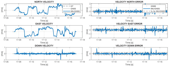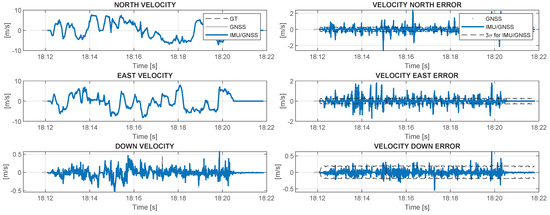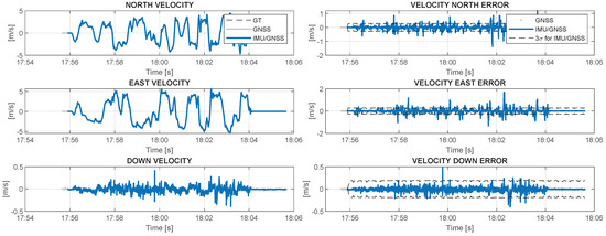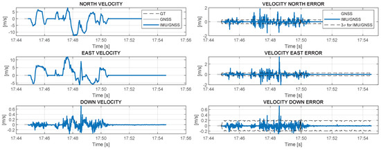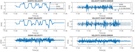 - calculation of the difference between the estimated position and velocity from the GNSS and INS solutions to assess IMU errors by integrating the estimated differences in a Kalman filter;