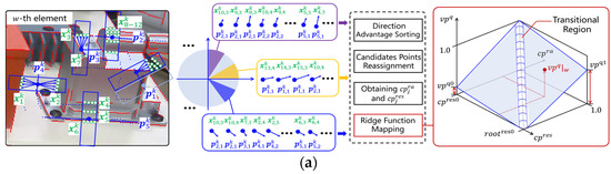 An improved virtual—real feature matching and similarity evaluation criterion. (a) Principles of viewpoint performance assessment. The blue and green points represent virtual features and candidate real features, respectively; (b) the effect after ridge function mapping.
