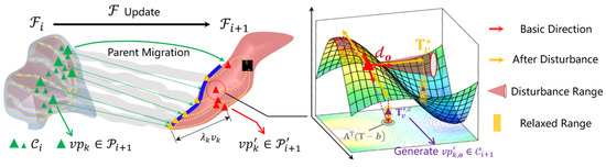 As shown in Figure 5, a parent migration mechanism is proposed to ensure that the population performance can be gradually improved with the update of . The migration operation is defined as and of , which denotes the pose of the migrated parent, can be expressed as