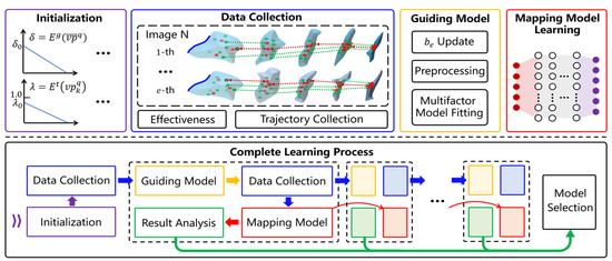 As shown in Figure 6, a learning mechanism for optimizing the evolution function is proposed. The learning stage consists of three main modules and is designed as a hierarchical cyclic process. In the data collection module, each image of the dataset is repeatedly tested according to the current evolution function, and the evolution trajectory of the viewpoint with the best effectiveness in each test is collected. The effectiveness of the -th round -th viewpoint is defined as