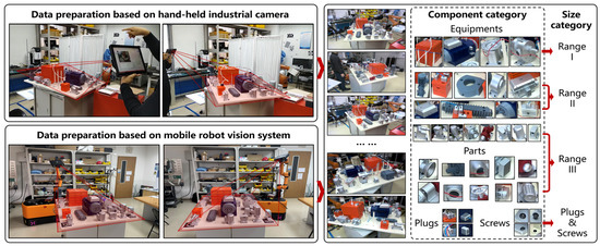 (2) Task features: These assembled products with high structural complexity may involve dozens or even hundreds of components, typically assembled through human or human–machine collaboration. Under such operation scenarios, it is difficult to collect enough high-quality samples at once or accurately pre-plan the imaging pose. The task features of a small sample, multiple components, and coarse initial pose greatly increase the difficulty of pose estimation/adjustment in common vision-based applications, e.g., AR/VR-based projection [4] mobile robots based on viewpoint pre-planning [5,6].