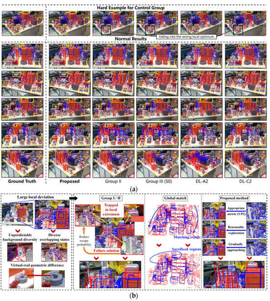 (1) Setting strategies. (a) Divide object set based on assembly relationships and part sizes, and define a rule for sub-object to gradually participate in evolution; (b) given an empirical viewpoint, obtain the initial pose through the strategies provided in this article or studies [48,49,50]; (c) considering both uniform distribution and matching residuals, determine the constraint features for feasible region initialization; (d) choose to adjust VPS or replace it with other matching strategies based on the object structure; (e) select the number of termination evolution rounds based on observations; and (f) choose whether calibration optimization is needed based on the characteristics of the scene.