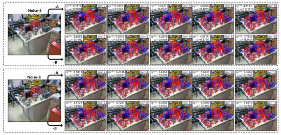 In this way, the four aspects of structural stability, error direction, number of matching points, and distance error can be integrated. For the -th component, let denote the result mapped by (3). The white numbers in the second row of Figure 3 represent (first row) and (second row). To maintain consistency with the gradient direction of distance error, let in Figure 3. For some matching states that cannot effectively distinguish, provides reliable discrimination. The viewpoint performance can be calculated according to . If the and obtained by root are not updated in time during the evolution stage, the evaluation will encounter greater viewpoint ambiguity and differences in geometric features. Therefore, by configuring different rendering frequencies, the adaptability of the proposed method with respect to the degree of virtual–real difference is deeply evaluated in Section 3.