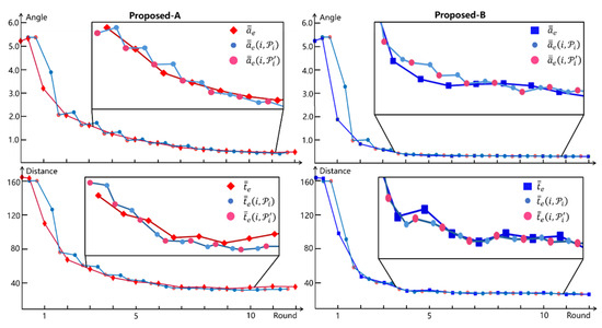 The viewpoint difference was adjusted by setting the total rendering times of the evolution process. For example, Group 2 means that only the first two rounds enabled rendering. The virtual image rendering was performed based on the viewpoint with the best in each round. The upper limit of iteration rounds was set to 11, and the results are shown in Table 5. By comparing the results of Group 1 in Table 5 with those of Proposed-A in Section 3.2, it can be further found that the value of evolution function optimization. The results of Groups 1~3 prove the adaptability of the proposed method to the differences between virtual and real viewpoints and the geometric feature inconsistency caused by them. The pose estimation accuracy is positively correlated with the rendering times. By observing the change in from Groups 4 to 11, we can find that rendering times are not the more, the better. Since suitable results usually appear in the 6th to 9th rounds and then tend to be stable, the difference between virtual and real features brought by additional rendering will stimulate more exploration, which will lead to fluctuation in results and an increase in . Therefore, the balance between accuracy and performance should be determined based on practical applications.