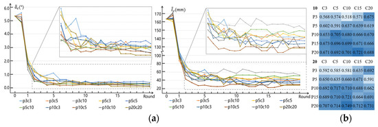 The influence of the number of parents and children on the performance. (a) Pose performance during evolution. (b) Skews () under different configurations when = 10 and = 20.