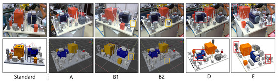 This section verified the adaptability of the proposed method to the appearance difference (e.g., product at different stages or lightweight model) and viewpoint difference between the virtual model and real product. The setting of appearance difference is shown in Figure 13, where A, D, and E were not equipped with cables, one device belonging to Range II was removed in B1, one virtual component belonging to Range II was removed in B2, and C = B1 + B2. Additionally, the visual style of Groups A–C was different from the standard, and the part dimensions of Groups D and E were modified, as shown in Figure 13, respectively. The dataset was adjusted according to the above changes, and the experimental results are listed in Table 4.