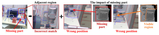 The results proved the adaptability of the proposed method to state differences, especially to visual feature changes caused by the differences in model rendering style. Moreover, pose errors of Groups A, D, and E reflect that sparse context changes such as component size modification have less impact on the performance than rendering style changes. Although the error of Group C is close to , 69.59 mm, the proposed method still has an advantage over the existing methods listed in Table 1. The impact of a missing part is significant, and the reasons are shown in Figure 14. The current object has a high similarity with the component behind it in this viewpoint, and mismatching is considered a high-quality correspondence. Moreover, when occluded components participate in matching, their features are extremely different from the region that contains a missing part but rather highly similar to the noise. Therefore, the coupling of the above situations prevents anomalies from being intercepted by VPS, causing viewpoints that should have been discarded to always participate in feasible region construction and evolution, resulting in continuous accumulation of errors.