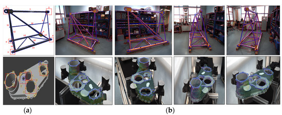 The first row shows a large-sized truss-type product painting task, and the second row introduces the assembly and gluing of porous structural components assisted by AR. The core task of both cases is pose estimation, and their respective problems correspond to a part of the experimental platform. The test results show that the proposed method can improve the initial error of the former from , 80 mm to , 17 mm, and increase the hole projection deviation of the latter from <0.1 to >0.5. Some valuable setting strategies and potential limitations analysis are as follows.