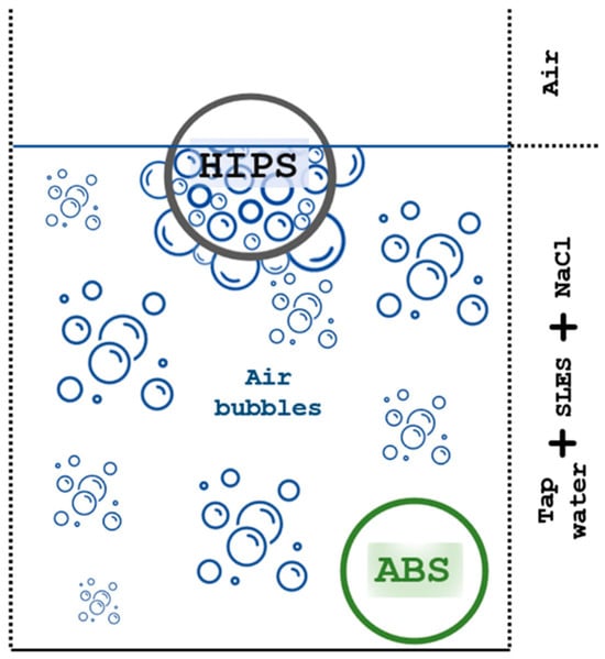 Scheme of flotation recycling—flotation tank with air bubbles and the plastics: HIPS and ABS.