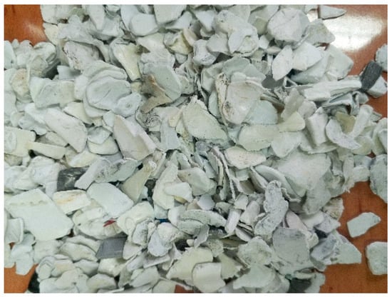 The tested materials were approximately 1.5 cm thick high-impact polystyrene (HIPS) and acrylonitrile–butadiene–styrene (ABS) flakes (Figure 2). Plastics were created as a result of the recycling of refrigeration equipment: refrigerators, freezers and refrigerator–freezers for commercial or domestic use.