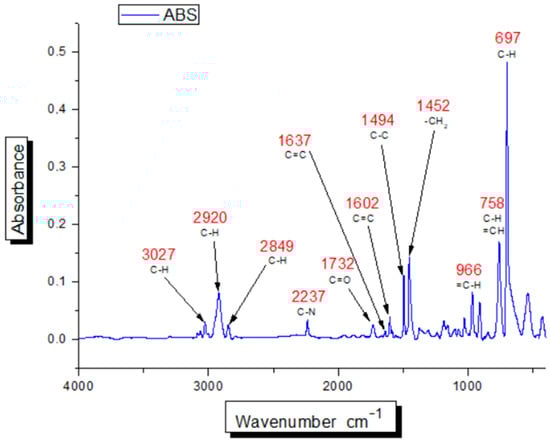 Figure 4 shows the FTIR analysis for ABS and HIPS plastics. The peaks located at 697 cm−1, 758 cm−1, 2849 cm−1, 2920 cm−1 and 3027 cm−1 correspond to a single bond between carbon and hydrogen (C-H). The band wavelength at 1494 cm−1 corresponds to single bonds between two carbon atoms (C-C). A characteristic bond can be distinguished between carbon and nitrogen (2237 cm−1). Vibrations of the methyl group are visible at a frequency of 1452 cm−1. The peaks observed at 1602 cm−1 and 1637 cm−1 correspond to the double bond between two carbon atoms (C=C). Vibrations of the C=O groups are visible at approximately 1732 cm−1. The spectrum shows vibrations at wavelengths of 758 cm−1 and 966 cm−1, corresponding to those of the =C-H group [16,25,26].