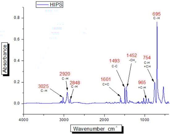 Figure 5 shows the FTIR analysis for the HIPS plastic. The peaks observed at 695 cm−1, 754 cm−1, 2848 cm−1, 2920 cm−1 and 3025 cm−1 correspond to the single bond between carbon hydrogen atoms (C-H). Vibrations of the methyl group (-CH2) are visible at a frequency of 1452 cm−1. The peaks located at 754 cm−1 and 965 cm−1 correspond to the double bond of carbon (=C-H). Vibrations of the C=C groups are visible at approximately 1601 cm−1. The spectrum shows vibrations at a wavelength of 1493 cm−1, corresponding to those of the C-C bond [16,25,26].