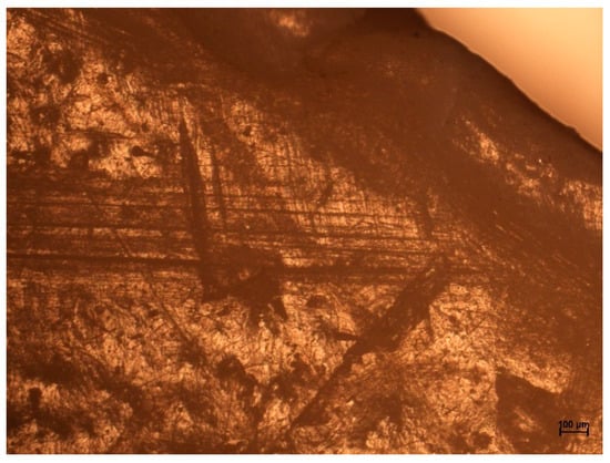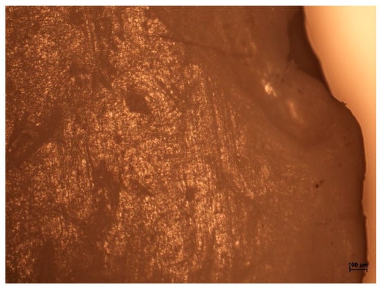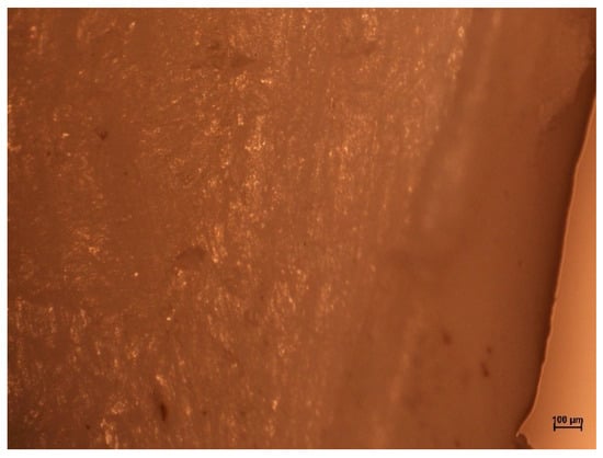 The results for the solution including only tap water (0.00 g/L SLES) confirm the information reported in the literature about the similar degrees of wettability of HIPS and ABS [15,16,17,18,19]. In the paper [15], the difference between the contact angles of HIPS and ABS using only distilled or deionized water was 3.10°; in [16], 0.15°; in [17], 1.16°; and in [18], 0.41°, and that presented in the master’s thesis [19] was 0.86°. Comparing the results of the difference in the contact angles after the change in the nature of the HIPS and ABS surfaces presented in the papers [15,16,17,18,19], the result obtained in this paper is the smallest—amounting to 10.76°. This result is similar to that obtained in the paper [18] (10.89°). It should be noted that the presented studies were carried out at room temperature, and in [15,16,17,18], an elevated temperature (from 60 °C to 70 °C) was used. This reduces energy consumption in the process. The other advantages distinguishing the results obtained in these studies are the low concentration of NaCl (0.10 or 0.20 g/L NaCl), and the easy availability of salt and its favorable price. According to Table 9, the wettability for the other concentrations did not bring the expected results (the difference in the contact angles was too small). The high standard deviation ranges are due to unevenness and impurities on the surface of recycled plastics, which was one of the biggest challenges of this study (Figure 6, Figure 7, Figure 8 and Figure 9). Such a surface has an impact on the obtained results of contact angle tests because a rough surface will mean that the contact angle will never be constant [42,43].