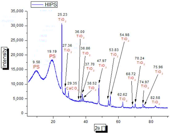 XRD testing revealed the presence of TiO2, which most likely comes from the white pigment. Moreover, in addition to titanium oxide, HIPS contains calcium carbonate, which is a frequently used filler affecting the properties of the material and reducing its price. The mass percentages of additives can vary depending on the manufacturer’s objective.