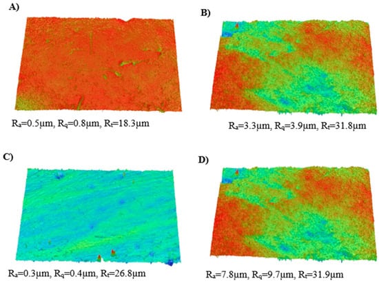 Optical profilometry (0.9 × 1.3 mm): (A,B) HIPS; (C,D) PS plates. Ra—the average roughness as calculated over the entire measured array, Rq—the root-mean-squared roughness calculated over the entire measured array, Rt—the peak-to-valley difference calculated over the entire measured array.