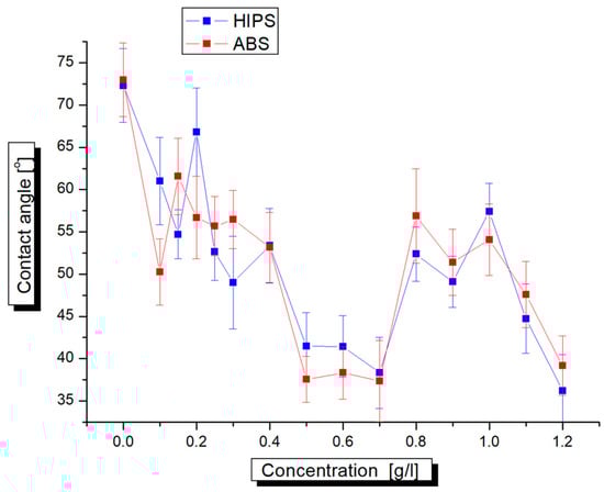The averaged test results with the standard deviations are given in Table 9. The difference in the contact angles for HIPS and ABS using only tap water is 0.70°. The largest differences in the contact angles occur at concentrations of 0.10 and 0.20 g/L SLES, being 10.76° and 10.10°, respectively (Figure 14). The standard deviations for the contact angles range from 2.90 to 5.48.