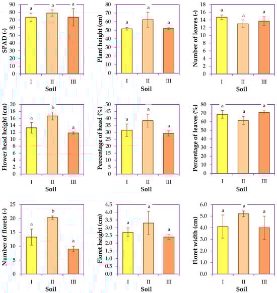Differences in the biometric parameters of broccoli plants grown in the analyzed soils are presented in Figure 1. Significant differences were noted only in flower head height and the number of florets between broccoli plants grown in soil II vs. soils I and III. In comparison with plants grown in soils I and III, plants grown in soil II were characterized by the highest average SPAD index; plant height; flower head height; percentage of flower head in total plant weight; number of florets, floret height, and floret width; and the lowest number of leaves and the lowest percentage of leaves in total plant weight.