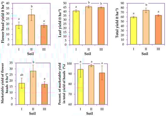Differences in the yield of broccoli plants grown in the analyzed soils are presented in Figure 2. Broccoli plants grown in soil II were characterized by the most favorable biometric parameters, which was also reflected in the highest yields. The average flower head yield ranged from 18.6 t ha−1 (soil III) to 28.8 t ha−1 (soil II), and the differences in yield between soil II and soils I and III were significant. The yield of leaves from plants grown in soil I was significantly lower than the yields achieved when plants were grown in soils II and III. The average leaf yield ranged from 40.8 t ha−1 (soil I) to 45.8 t ha−1 (soil II). The total yield of broccoli plants ranged from 57.7 t ha−1 (soil I) to 80.0 t ha−1 (soil II), and the average value of this parameter reached 59.7 t ha−1 in soil I, 74.6 t ha−1 in soil II, and 63.6 t ha−1 in soil III. The differences in total yield between soil II vs. soils I and III were significant. Broccoli plants grown in soil II were also characterized by the highest marketable yield of flower heads (12.2 t ha−1 on average), and the difference in this parameter relative to plants grown in soil III was significant. Similar yields of two broccoli hybrids were noted by Hamza and AL-Taey [23]. In the cited study, organic fertilizers exerted a particularly positive effect, which indicates that a higher content of organic compounds in soil promotes higher yields.