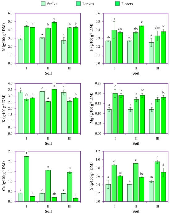 Effect of soil type on the macronutrient content of broccoli stalks, leaves and florets: a, b, c, d, e, f—various letters denote significant differences at p < 0.05 (Tukey’s test); I—Eutric Cambisol; II—Albic Luvisol (Arenic); III—degraded chernozem.