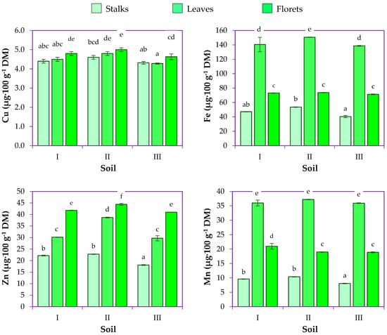 The content of copper and zinc was highest in the florets (5.0 μg 100 g−1 DM and 44.4 μg 100 g−1 DM, respectively), and the content of iron and manganese was highest in the leaves (150.6 μg 100 g−1 DM and 37.2 μg 100 g−1 DM, respectively) of broccoli plants grown in soil II. In comparison with the micronutrient content of florets, leaves contained less copper (by approx. 6% on average), more iron (by approx. 97% on average), less zinc (by approx. 23% on average), and more manganese (by approx. 86% on average). In comparison with the micronutrient content of leaves, stalks contained less copper (by approx. 8% on average), iron (by approx. 35% on average), zinc (by approx. 51% on average), and manganese (by approx. 52% on average). The greatest disproportions in micronutrient concentrations were noted with regard to the manganese content of leaves and stalks, and the smallest—with regard to the copper content of stalks and leaves. These results corroborate the findings of Marschner [27] and Page and Feller [28].
