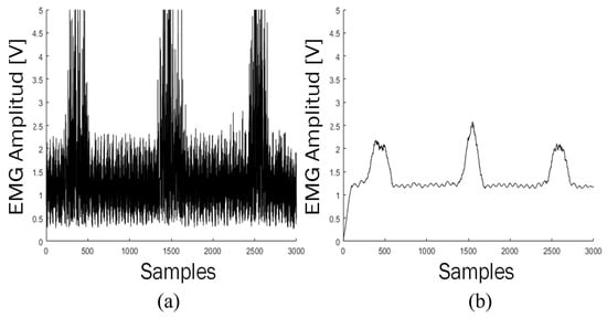 In Figure 2a, the original EMG signal is depicted, characterized by a high-frequency signal with a 500 Hz bandwidth. A smoothing technique was used to convert the original EMG into a low-frequency signal in real time, thereby offsetting noise and enhancing signal smoothness (Figure 2b). The acquired original EMG signals were then transmitted to Unity through serial communication, where they underwent real-time smoothing processing as a preprocessing step utilizing a moving average filter. Algorithm 1 is the pseudocode implemented in Unity for the moving average filter.