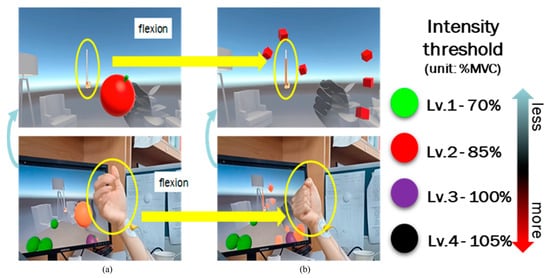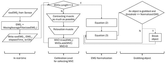 As in Equation (3), the normalized EMG values were derived through min–max normalization based on the mean MVC value and the real-time input of smoothed EMG values [12]. After data preprocessing, the real-time input of normalized EMG values was utilized to trigger events according to the grip strength of the objects.