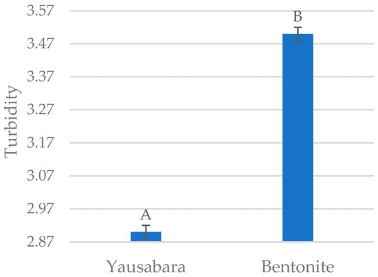 The turbidity values previously obtained with Equation (1) were found within the range 2.749 to 3.838, finding greater efficiency with applying the ‘yausabara’; however, all values were within the range reported by Ibáñez [25]. The Mann–Whitney U test shows that there is statistical significance between fining agents, as the p-value is lower than 0.05 (Table 1). It was performed for one factor (clarifying agent) with two levels (‘yausabara’ and bentonite) to determine whether there is a difference in fining agent efficiency.