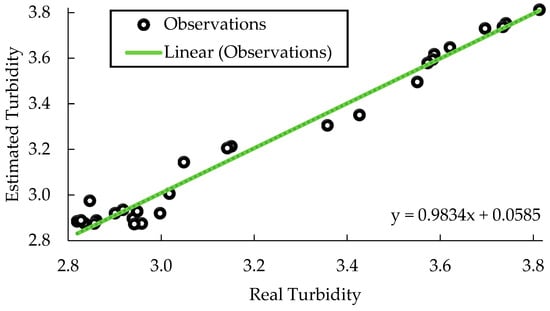 Considering the maximization of R2, the neural network trained with the Levenberg–Marquardt algorithm with 25 neurons in the hidden layer was selected, which presents an R2 of 0.988. A similar value was obtained in other investigations that have trained neural networks with the same algorithm but in different disciplines. In addition, it also presented some of the lowest values for MSE, RNSME, and AIC, demonstrating the feasibility of the supervised learning process for estimating turbidity. The actual versus estimated curve (Figure 2) also displays the efficiency of the neural network model observing a good fit between predicted and experimental values, as mentioned by Noor et al. [30] and Sahin et al. [38], which is also explained for the upper value of R2, justifying the selection.