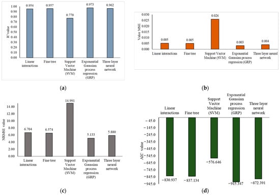 Regression Learner performance metrics: (a) coefficient of determination, (b) mean square error, (c) normalized root mean square error, and (d) Aikake information criterion.