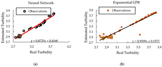 Considering the model with the best validation metrics, it can be inferred that ANN represents a forecasting performance with high accuracy (Figure 4). It can be justified because it models complex and nonlinear processes based on a data set using high self-adaptive learning without requiring a normal distribution like conventional methods [55]. Exponential GPR can face challenges in normative modelling due to its assumptions and complexities. These limitations can impact the accuracy and reliability of predictions, especially in scenarios like turbidity prediction, where precise modelling is crucial [56]. While both ANN and GPR have advantages and disadvantages, ANN represents a highly accurate and adaptable approach to complex forecasting tasks. This technology will likely provide valuable insights and predictions that can drive improved decision-making and performance.