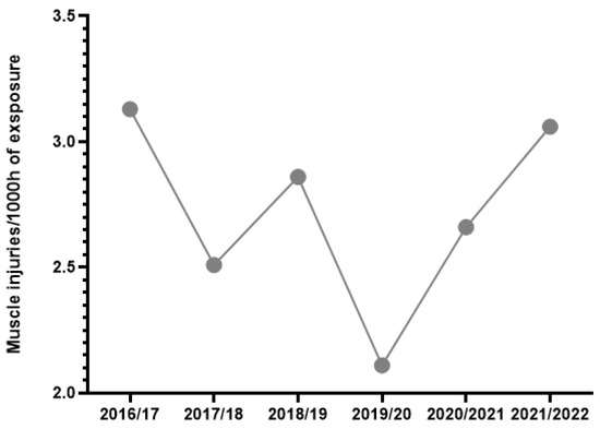 Descriptive data were presented, including arithmetic means and standard deviations. The muscle injury incidence was calculated as the number of injuries sustained per 1000 h of exposure. The injury incidence rate ratio and the 95% confidence intervals were calculated between the first and the last observed season.