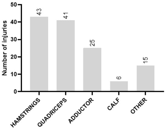 The majority of the injuries occurred in the lower body, with hamstrings (N = 43) and quadriceps (N = 41) being injured most frequently. Besides these two groups, U15 players suffered significant amounts of adductor injuries (N = 25), while only six calf injuries were reported in the observed period (Figure 2).