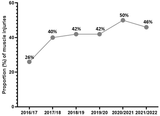 In general, there is an evident increase in the proportion of muscle injuries throughout the 6-year period. As the total number of other injuries (e.g., bone and joint injuries) decreased over the years, a relative increase in muscle injury incidence occurred due to a relatively stable absolute number of muscle injuries. On average, 41% of all injuries incurred are related to the muscular system. This is in agreement with previous studies, where 37% and 45% of injuries at elite senior and youth levels were observed, respectively [11,43].