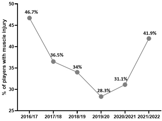 Figure 4 shows that the incidence rate of players suffering a muscle injury had a downward trend until the 2019/2020 season (i.e., from 46.7% to 28.3% of players with muscle injuries), with that trend being altered and rising up to 41.9% in the last season. This implies that in the U15 team of 20 players, approximately 8 of them can expect muscle injury over the one-season period.