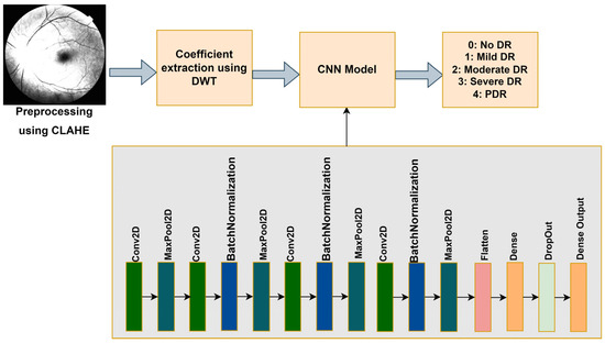 The proposed study employs a CNN model with preprocessing methods such as CLAHE and DWT (Figure 4). The model predicts five stages of DR. Not all previous studies utilized different datasets for evaluation, which lacks the model’s generalizability. Significantly, few studies are related to CLAHE and DWT preprocessing with DR image data. Adam is frequently used due to its broad usefulness across various situations. Because of its ability to traverse the optimization landscape efficiently, Adam is one of the most often used optimizers for deep learning model training [64]. The performance comparison of the study with previous research is illustrated in Table 7.