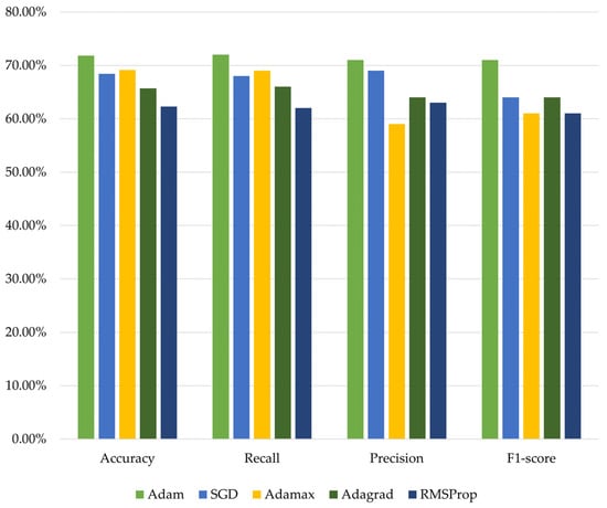 Optimization methods are essential to machine and deep learning model training for enhancing the model’s predictions. Various techniques have been created to tackle specific optimization problems, including handling sparse gradients or quickening convergence [64]. In this study, we utilized different optimizers to ascertain the most effective one. SGD, Adam, Adagrad, Adamax, and RMSProp were the five optimizers employed.
