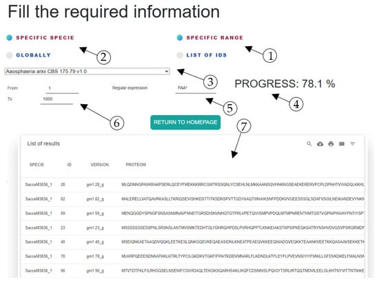 GUI of FungiRegEx. Element 1 and Element 2 allow the user to choose the type of search; Element 3 is a selector of the species; Element 4 is a progress indicator; Element 5 is the Regular Expression input (where * means any character); Element 6 is the range input; Element 7 is the table of results.