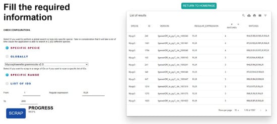 Figure 6 shows that FungiRegEx can find the effector of interest in the proteome. In addition, it is identified that Mycosphaerella graminicola has the effector RXRL []. Also relevant to the results is that a counter is increased each time the tool finds the regular expression in the sequence, and its value is displayed in the “# MATCHES” column.