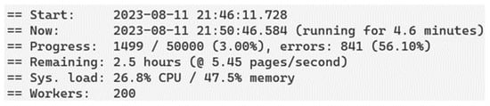 With 200 puppeteer instances, 50,000 results are obtained in approximately 139 min, as can be seen in Figure 7, with the estimated time that indicates the monitor (depending on the resources of the computer, the computer can consult at least seven pages per second; this means that the 50,000 results can be consulted in only 12 min); it also clarifies that this depends on the available computer resources.