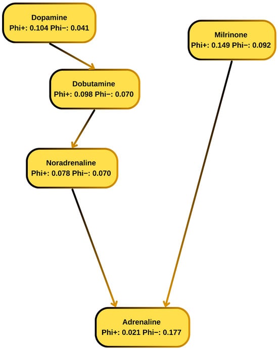 Within the limitations of the proposed research, Figure 1 and Figure 2 visually illustrate the ranking of each inotrope alternative. The distance between each alternative represents their relative “score” to each other, and this is represented by phi values that can also be found in Table 3 and Table 4. The highest placed inotrope within each figure scored best, and the arrowed line flow represents the next lower rank. For example, looking at Figure 1, it can be said that there is not a big difference in the rankings of dopamine and noradrenaline for the acute HFrEF patients, as there only have several slightly better graded property values that account for the first rank placement of dopamine over noradrenaline.