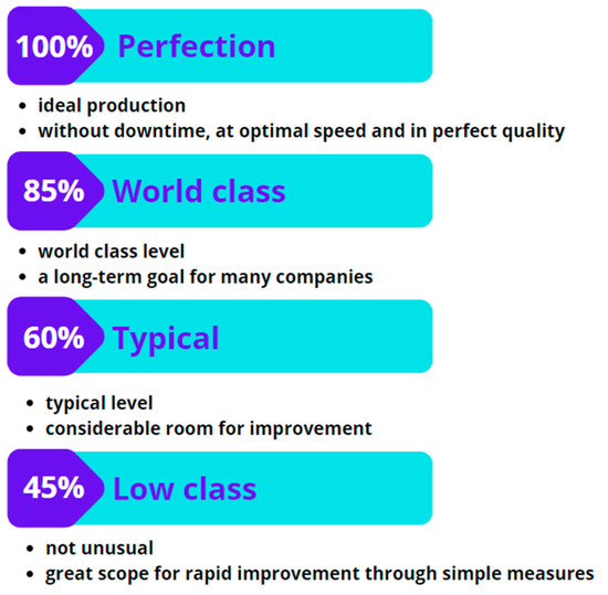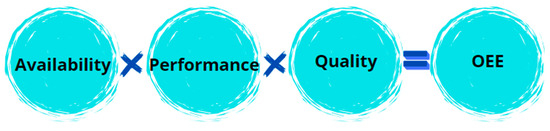 Addressing customer needs and meeting expectations while establishing objectives is paramount. In achieving this, maintaining a continuous production schedule assumes considerable importance and is central to this efficient material handling, encompassing the strategic planning of procurement, receiving, sorting, and delivery of materials for consumption in production, all underpinned by effective control measures [8,9]. It is evident that industrial goods, serving as inputs for other physical products, constitute materials subject to management, known as material handling [9,10]. Material handling encompasses all activities, tasks, and processes involved in the transfer of external materials and services into the organization [9,11]. Optimal material handling serves as a tool to enhance organizational efficiency by importing skills in reducing defective products, shortening operating cycles, lowering handling costs, eliminating unproductive material handling, reducing idle machine capacity, and mitigating factory hazards [9,12]. Logistics facilities are interpreted as transshipment terminals, distribution or production sites, but all of them have one shared goal, and that is global optimization [13]. Boosting productivity remains the primary challenge for companies striving to compete in the global market. Productivity in industrial enterprises relies on efficiency, which encompasses the resources needed to achieve desired outcomes including time, financial investments, and energy expended during the production process. Efficiency, in essence, reflects the ability to meet social needs and incorporates the economic contributions of staff members. It manifests across various production stages and can be measured through multiple metrics. It is essential to distinguish between efficiency, effectiveness, and productivity, as productivity evaluation integrates efficiency. Productivity, gauged by the ratio of actual output to input, directly influences both efficiency and effectiveness. For instance, equipment efficiency indicates the cost-effective operation, measured by the ratio of outputs to inputs. Every company strives to minimize costs, maximize performance, and optimize assets. For manufacturing firms, solutions enhancing production efficiency have become paramount. Overall equipment efficiency (OEE) serves as a pivotal performance indicator, enabling the measurement and comparison of individual production equipment efficiency within a company. It aids in monitoring and enhancing the production process, identifying and addressing losses, monitoring order progress, and conserving energy and human resources. OEE calculation provides a clear quantitative tool for assessing productivity, which is illustrated in Figure 2. By pinpointing areas for improvement and promoting transparency, it contributes to optimizing equipment efficiency, thereby enhancing overall operational performance [14].