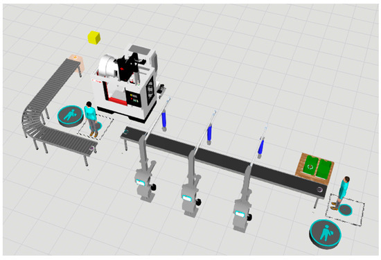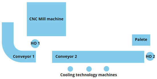 The manufacturing process for these inspection involves the production of rotor pockets, which are treated as blanks and then forwarded to the next workstation to assemble the rotors. The production process runs 24 h a day and is divided into three shifts of 8 h each, with 1 h each shift serving as the insured value of the inventory. Material and information flows are managed according to JIT principles and the company manages it through an internal network with real-time connections to suppliers and customers. Control is performed by reading the code of the executed process, or directly by reading individual products, materials or semi-finished products. The structure of production line Z, shown in Figure 5, is used to describe and analyse the current status, and also represents the conceptual model for the subsequent design of the simulation model itself. At workplace Z, the production target is to grind the input material in the form of 8 kg aluminium blocks (or ingots—there is no difference) as the raw material for the rotor slots. It is important to maintain the quality of the input material in the form of 99.97% aluminium, otherwise, not only the quality of the product itself, but also its production process would be at risk, since this parameter is important when cooling the product. The production process begins by transporting aluminium ingots via a conveyor belt connected to an input material warehouse, where the company melts the incoming 900 kg of aluminium ingots into the required 8 kg aluminium ingots. The operator then feeds the block into a CNC milling machine. The CNC milling machine programme for a specific shift is determined by the programmer in the scheduler section based on the production plan for each period. After the milling process, the rotor pockets are transferred to another conveyor belt for cooling and marking the final stage of production of rotor pockets. The cooling process is meticulously orchestrated under a veil of secrecy, with temperature parameters carefully guarded as proprietary knowledge, bestowing upon the company a competitive edge withing the market. Following the completion of this phase, human operators delicately transfer the rotor pockets back to their respective handling units. These encased components are subsequently entrusted to a sophisticated logistics train, meticulously choreographed to navigate the intricate pathways traversing the company’s premises. Operating within this workstation are stringent constraints, including predetermined production timelines for the milling of rotor pockets, the perpetual motion of materials along belt conveyors fixed in place by the company, and the exacting adherence to precise technological protocols and quality standards. Furthermore, meticulous attention is devoted to ensuring compliance with technical specifications governing production. The layout depicted in the visual representation of the Z production line in Figure 5 serves a dual purpose: elucidating the current operational framework while also furnishing a conceptual blueprint for the subsequent development of the simulation model itself.