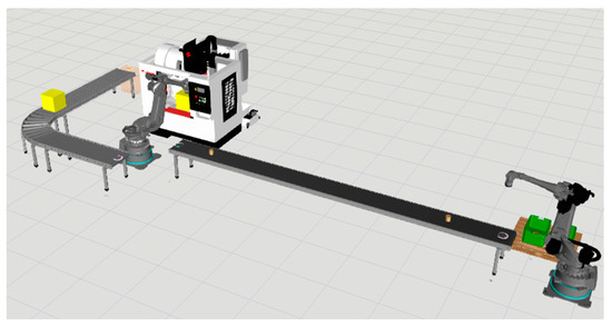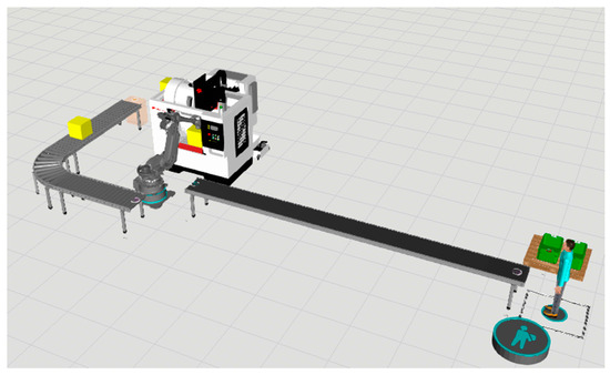 Exploring various models or potential solutions to a given problem proved instrumental in identifying the optimal course of action while concurrently enhancing workplace efficiency. The pivotal decision to amend the model entailed substituting Human Operator no. 1 with a robotic arm, which you can see in Figure 9. This sophisticated robotic apparatus possesses the capability to navigate the designated area for conveying or manipulating components, thereby automating a task hitherto executed by a human operator. Nevertheless, determining the extent of the robotic arm’s efficacy vis á vis a human operator remains imperative, particularly concerning components’ material handling tasks in conjunction with a CNC milling machine.