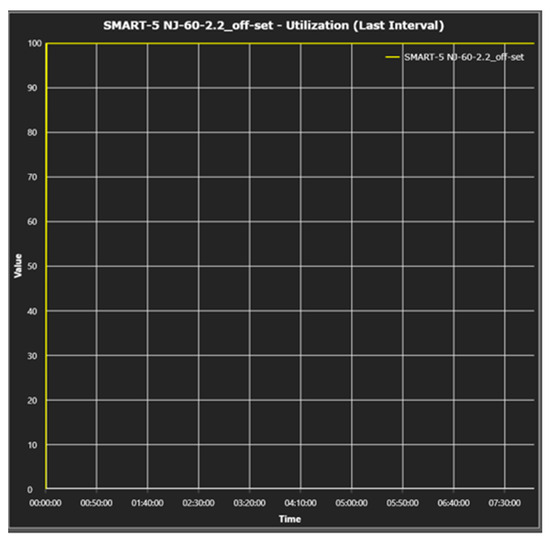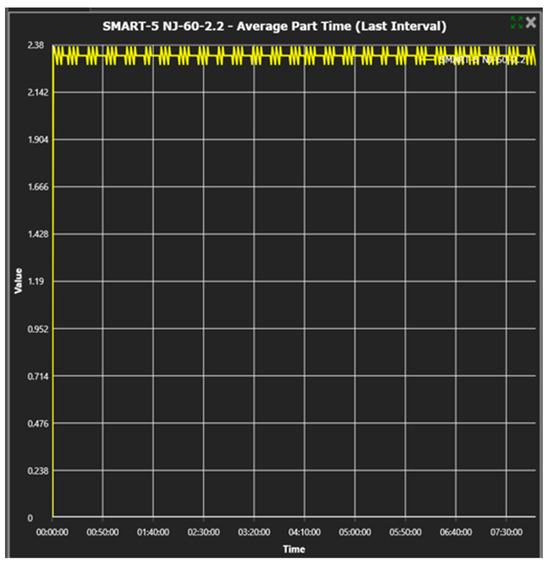 To address this dilemma, we devised a model illustrating fully automated operations, wherein we eliminated Human Operator no. 2 and substituted them with a second robotic arm. The results and parameters of the measured intervals and usability for the first robotic arm remain consistent. However, in this instance, we juxtapose the statistic of Human Operator no. 2 with a second robotic arm, as depicted in the ensuing figures. Evidently, the manipulation interval in this scenario is 2.49 s, signifying a remarkable time-saving or efficiency enhancement of 62% compared to the prior duration of 6.61 s. The results are shown in Figure 13 and Figure 14. Furthermore, akin to the initial model, the usability of the robotic arm stands at 100%, while once more, material handling is entirely obviated, aligning seamlessly with the company’s imperative for fully automated operations.