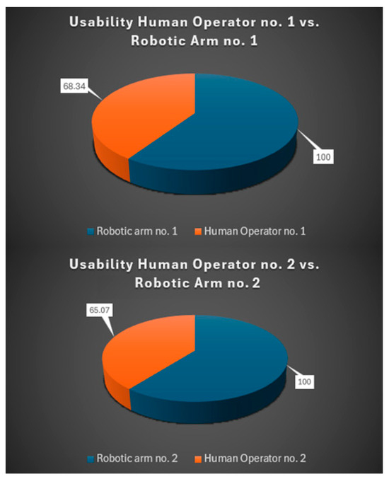 A pivotal stage of the research involved evaluating the gathered data and the outcomes of the simulations. These assessments aimed to validate the effectiveness of the proposed solutions and guide the formulation of requisite measures towards attaining the optimal solution. Throughout this process, the attained results from the existing scenario were scrutinized and juxtaposed with the latest iteration of a fully automated operation, given its superior efficiency. Comparative analyses were conducted, focusing on manipulation times and operator usability (robot vs. human operator), where comparisons are shown in Figure 15 and Figure 16.