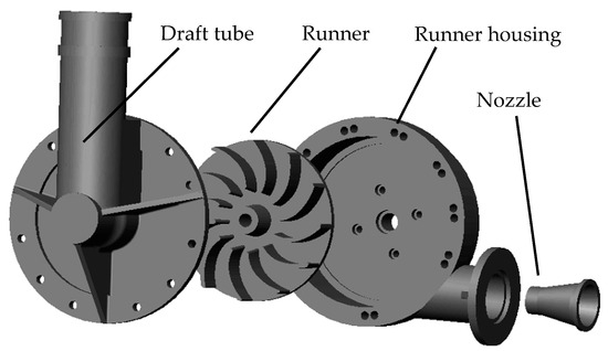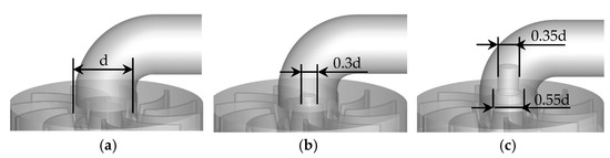 The water turbine geometry is shown in Figure 1. It consists of a nozzle, a runner, a runner housing, and a draft tube with a design flow rate of 17.5 m3/h and a design speed of 700 r/min. The structural parameters of the water turbine are listed in Table 1. The internal flow of the draft tube is analyzed for three cases, namely, the non-locking nut (NLN), small locking nut (SLN), and extended locking nut (ELN), as shown in Figure 2. The locking nut in the case of SLN does not extend into the elbow section, and the locking nut in the case of ELN extends into the elbow section.
