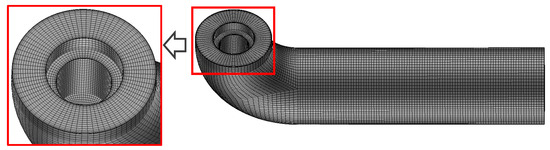 The commercial software ICEM CFD 17.2 is used to generate the hexahedral mesh of the computational domain, which is shown in Figure 3. The minimum quality of the mesh element is above 0.3. The calculation domain includes inlet pipe, inlet nozzle, runner, and outlet pipe. The runner is defined as the rotational component, while the inlet pipe, inlet nozzle, and outlet pipe are considered stationary. The Frozen Rotor interface was used in the connection interface between the runner and the runner hosing. The inlet and outlet boundary conditions are set to the normal boundary velocity and the average static pressure, respectively. The inlet velocity is set to the corresponding velocity under the design flow rate, and the outlet static pressure is set to the same value as the actual operation. All wall boundaries adopt non-slip wall conditions. The General Grid Interface (GGI) interface grid processing method is adopted. The governing equations adopt a high-resolution advection scheme. The convergence criterion is defined as having an RMS less than 1 × 10−5.