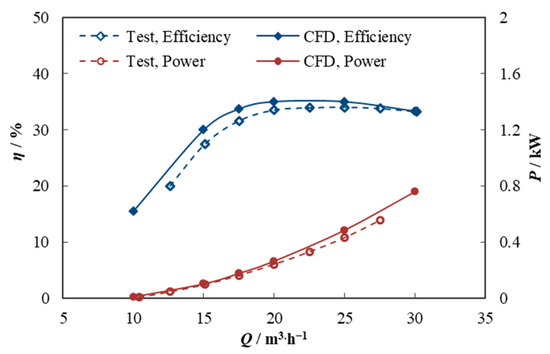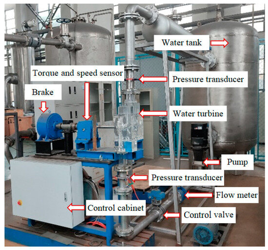 The performance test of the water turbine was carried out, and the test bench is shown in Figure 5. The experimental data are compared with the numerical data to verify the accuracy of the numerical results. Regarding design conditions, the prediction errors of efficiency and power are 4.6% and 3.8%, respectively, as shown in Figure 6. These percentage errors in the performance prediction of water turbines are well under acceptable limits. Therefore, the numerical model has reasonably good accuracy in predicting the water turbine flow field.