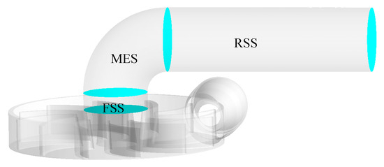 In order to better understand the internal flow of the draft tube is divided into three parts along the flow direction: the front straight section (FSS), the middle elbow section (MES), and the rear straight section (RSS), as shown in Figure 7. After the water flows out of the runner, it first enters the FSS, then enters the MES, changes the flow direction in this section, and then flows into the RSS.
